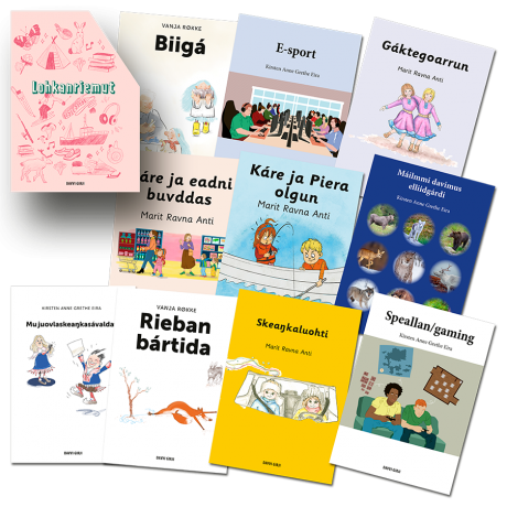 Boks som inneholder 10 lettleste hefter på nordsamisk. Heftene er både skjønnlitterære og faktatekster